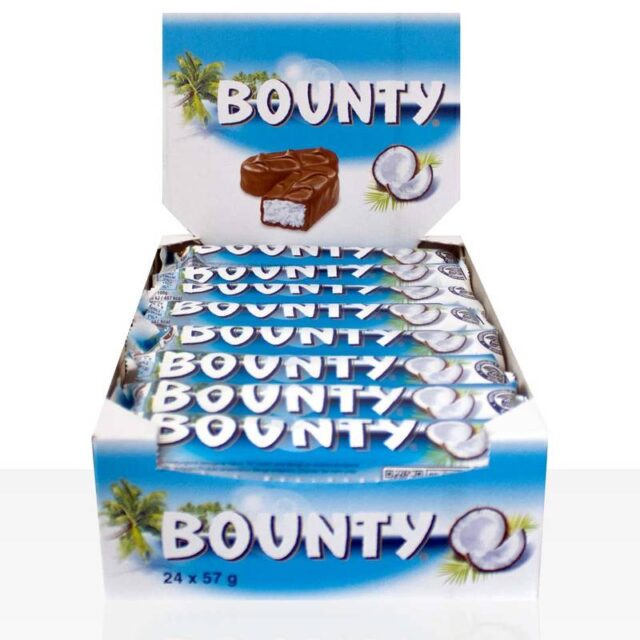 Bounty 24 x 57 g counter display – tropical chocolate bar classic in a practical sales display.